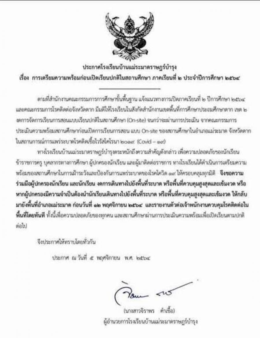 ประกาศ...การเตรียมความพร้อมก่อนเปิดภาคเรียนปกติในสถานศึกษา ภาคเรียนที่ 2 ปีการศึกษา 2564