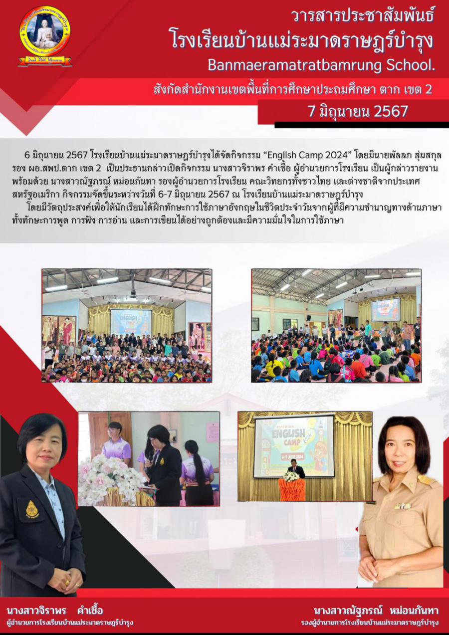 6 มิถุนายน 2567 โรงเรียนบ้านแม่ระมาดราษฎร์บำรุงได้จัดกิจกรรม ?English Camp 2024? โดยมีนายพัลลภ สุ่มสกุล รอง ผอ.สพป.ตาก เขต 2 เป็นประธานกล่าวเปิดกิจกรรม นางสาวจิราพร คำเชื้อ ผู้อำนวยการโรงเรียน เป็นผู้กล่าวรายงาน พร้อมด้วย นางสาวณัฐภรณ์ หม่อนกันทา รองผู้อำนวยการโรงเรียน คณะวิทยากรทั้งชาวไทย และต่างชาติจากประเทศสหรัฐอเมริกา กิจกรรมจัดขึ้นระหว่างวันที่ 6-7 มิถุนายน 2567 ณ โรงเรียนบ้านแม่ระมาดราษฎร์บำรุง โดยมีวัตถุประสงค์เพื่อให้นักเรียนได้ฝึกทักษะการใช้ภาษาอังกฤษในชีวิตประจำวันจากผู้ที่มีความชำนาญทางด้านภาษาทั้งทักษะการพูด การฟัง การอ่าน และการเขียนได้อย่างถูกต้องและมีความมั่นใจในการใช้ภาษา S:0