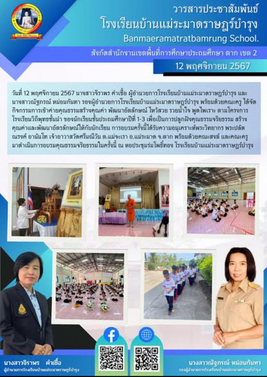 วันที่ 12 พฤศจิกายน 2567 นางสาวจิราพร คำเชื้อ ผู้อำนวยการโรงเรียนบ้านแม่ระมาดราษฎร์บำรุง และนางสาวณัฐภรณ์ หม่อนกันทา รองผู้อำนวยการโรงเรียนบ้านแม่ระมาดราษฎร์บำรุง พร้อมด้วยคณะครู โดยมีนางสุพรรณี แก้วปาเขียว เป็นผู้รับผิดชอบโครงการ ได้จัดกิจกรรมการเข้าค่ายคุณธรรมสร้างคุณค่า พัฒนาอัตลักษณ์ ไหว้สวย รวยน้ำใจ พูดไพเราะ ตามโครงการโรงเรียนวิถีพุทธชั้นนำ ของนักเรียนชั้นประถมศึกษาปีที่ 1-3 เพื่อเป็นการปลูกฝังคุณธรรมจริยธรรม สร้างคุณค่าและพัฒนาอัตรลักษณ์ให้กับนักเรียน การอบรมครั้งนี้ได้รับความอนุเคราะห์พระวิทยากร พระปลัดณรงค์ อานันโท เจ้าอาวาสวัดศรีมณีวัน ต.แม่จะเรา อ.แม่ระมาด จ.ตาก พร้อมด้วยคณะสงฆ์และคณะครูมาดําเนินการอบรมคุณธรรมจริยธรรมในครั้งนี้ ณ หอประชุมร่มโพธิ์ทอง โรงเรียนบ้านแม่ระมาดราษฎร์บำรุง https://www.facebook.com/photo/?fbid=1103951311734759&set=pcb.1103951341734756 S:0