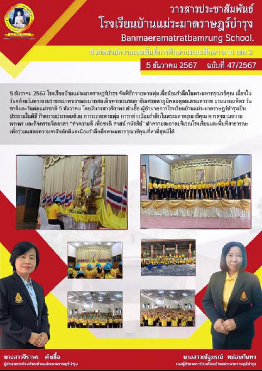 5 ธันวาคม 2567 โรงเรียนบ้านแม่ระมาดราษฎร์บำรุง จัดพิธีถวายพานพุ่มเพื่อน้อมรำลึกในพระมหากรุณาธิคุณ เนื่องในวันคล้ายวันพระบรมราชสมภพของพระบาทสมเด็จพระบรมชนกาธิเบศรมหาภูมิพลอดุลยเดชมหาราช บรมนาถบพิตร วันชาติและวันพ่อแห่งชาติ 5 ธันวาคม โดยมีนางสาวจิราพร คำเชื้อ ผู้อำนวยการโรงเรียนบ้านแม่ระมาดราษฎร์บำรุงเป็นประธานในพิธี กิจกรรมประกอบด้วย การถวายพานพุ่ม การกล่าวน้อมรำลึกในพระมหากรุณาธิคุณ การลงนามถวายพระพร และกิจกรรมจิตอาสา ?ทำความดี เพื่อชาติ ศาสน์ กษัตริย์? ทำความสะอาดบริเวณโรงเรียนและพื้นที่สาธารณะ เพื่อร่วมแสดงความจงรักภักดีและน้อมรำลึกถึงพระมหากรุณาธิคุณที่หาที่สุดมิได้ S:0