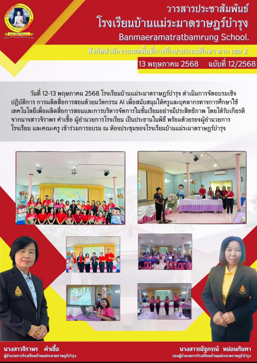 วันที่ 12-13 พฤษภาคม 2568 โรงเรียนบ้านแม่ระมาดราษฎร์บำรุง ดำเนินการจัดอบรมเชิงปฏิบัติการ การผลิตสื่อการสอนด้วยนวัตกรรม AI เพื่อสนับสนุนให้ครูและบุคลากรทางการศึกษาใช้เทคโนโลยีเพื่อผลิตสื่อการสอนและการบริหารจัดการในชั้นเรียนอย่างมีประสิทธิภาพ โดยได้รับเกียรติจากนางสาวจิราพร คำเชื้อ ผู้อำนวยการโรงเรียน เป็นประธานในพิธี พร้อมด้วยรองผู้อำนวยการโรงเรียน และคณะครู เข้าร่วมการอบรม ณ ห้องประชุมของโรงเรียนบ้านแม่ระมาดราษฎร์บำรุง S:0